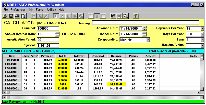 Assume you borrowed $100,000 and amortized the loan for three years starting at 8 % in the first year, 7% in the second year and 6% in the remaining third year. Monthly payments and monthly compounding were selected. QUESTION: How much interest would you save compared to paying 8% for the entire three years? Enter the data in the CALCULATOR section of the MORTGAGE2 PRO screen. The amortization schedule for that information will be immediately calculated and shown in the SPREADSHEET amortization schedule, as if the entire loan was to be at 8%. The entire schedule is not going to be at 8%, but you must start out in the calculator as that way then change the interest rates in the SPREADSHEET. Once changes are made in the amortization schedule SPREADSHEET the CALCULATOR information is no longer meaningful except as a reference point (Calculator Interest). Changes to the amortization schedule SPREADSHEET are now your focus. Using your mouse, place the cursor on the 12th payment interest rate cell (yellow) on the amortization schedule and change it to 7.000% and click on the cell, to insure the change is entered. When you click on the cell you will see the amortization schedule spreadsheet cells change indicating a cell change. Hold the shift key down and press the down arrow to highlight the cells down to the 24th payment and the amortization schedule should appear as below; Now do a Crtl+V (the standard Windows paste shortcut) and the amortization schedule appears as shown below; Do the same thing with interest rate cells 24 to 36 only this time using 6% and the amortization schedule will appear as below; All changes to the amortization schedule show up as yellow, however, the yellow colour for the portion of the interest rate column at 6%, was changed to green for ease of viewing in this example. Note, the monthly interest $223.83 portion for the 24th payment is determined by the value in the interest rate in the Int% cell above. This is how the program was designed to operate. Thus .07/12 x 38,370.98 = $223.83 You now have an amortization schedule for three years with a declining rate of 8%, 7% and 6% in the final year. The total interest cost due to the declining rates is $11,804.16 (Spreadsheet Interest) compared to $12,810.92 had you remained at the initial 8% throughout the 36 months (Calculator Interest). ANSWER: The declining rate, for this 3 year amortized loan, saved you $1,006.76 (12,810.92-11,804.16=1,006.76). The three year amortization period was purposely chosen in order to explain deemed reinvestment and show the significance of the effective interest rate. A 30 year amortization period example is shown at the bottom of this page and the savings achieved because of the three year declining rate are more significant.