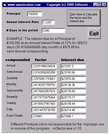 THE STORY BEHIND THE STORY A unique feature of MORTGAGE2 PRO is the ability to generate a negative amortization schedule. By generating an negative amortization schedule (all the payments set to zero) the future value of all the payments at the appropriate interest rates can be calculated. Using the mouse move the cursor up to the first payment and enter 0 (zero) and then click on the cell to ensure the change has been entered. Hold the shift key down and press the down arrow to highlight the cells down to and including the 36th payment line, and then do a Ctrl+V to copy the zero payments all the way down to the 36 th line of the schedule. In the balance column at the 36th payment is the value of $123,291.54 This is the future value of $100,000 appreciating at 8% in the first year, 7% in the second year and 6% in the final year. If the lender reinvests each monthly payment when received, this is the true return the lender achieves at the end of three years, that is $23,291.54 on the intial loan of $100,000. Using an ordinary financial calculator or the MORTGAGE2 PRO utility; The effective interest rate (EIR) of this 3 year loan (ARM) is 7.2287% As a cross reference, using the free downloadable m2factor.exe utility from the amortization.com site, the interest earned by the lender after 3 x 365 days (deemed reinvestment) is the same, that is $23,291 (see the annual rate below at $23,291.50). When a loan is annually compounded the effective interest rate and the nominal annual interest rate are the same. The real time saving convenience of the MORTGAGE2 PRO, negative amortization schedule feature is really appreciated when one needs to evaluate an ARM where the interest rate changes every month, the payments change each month and extra prepayments are made in between regularly scheduled payments. The deemed reinvestment feature would be very very time consuming if done manually as individual present value/future value calculations on a calculator. As a further point of interest if one used the effective interest rate of 7.2287% with annual compounding and did a negative amortization schedule, the same future value of $123,291.49 is achieved (the yellow highlighted cell in the balance column).