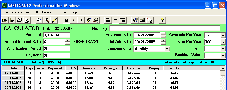 based upon future costs Enter a monthly payment of $20 for 25 years at 6% and let the CALCULATOR show you what you could borrow. The Principal of $3,104.14 is really the present value of a series of $20 monthly payments over the next 25 years at 6% using monthly compounding. Screenshot 4 is the negative amortization schedule showing that the Present Value/Future Value calculator agrees with the negative schedule (within pennies) as it should. Subtract the $3,104.14 from the Principal and recalculate on the Annual Interest Rate and the APR becomes 6.3351% as shown below.