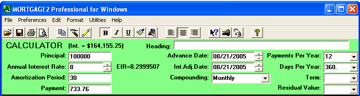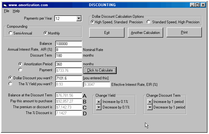 APR based upon variable future costs QUESTION: What if the borrower had monthly insurance premiums that were not constant but varied in the future? For example, using an 8%, 30 year amortized mortgage with monthly payments and monthly compounding on an amount of $100,000 as shown below. The first 10 years the monthly insurance premiums would be $81.67 and the next five years the premiums would be 16.67 per month. The present value of these two insurance premiums future cash flows must be calculated using 8% as the interest rate. Using the "3 out of 4 feature" in MORTGAGE2 PRO CALCULATOR we pretend we are going to borrow money at 8% for 10 years with monthly payments of 81.67 and the Principal will automatically be calculated as $6,731.36 which is the Present Value of that 10 year future cash flow. Now do the same for monthly insurance premiums of $16.67 but we must also do a PV-FV calculation to bring the $822.14 further back ten years to the present. The Present Value of the cash flows of the two insurance premiums is 6,731.36 + 370.40 = $7,101.76 and using the discounting program, the APR is 8.93% based upon 15 years (The % Yield you want). As can be seen below the APR based upon the full 30 years is 8.8% and that was easily calculated by pressing the up arrows and increasing the Discount Term to 360 months.
