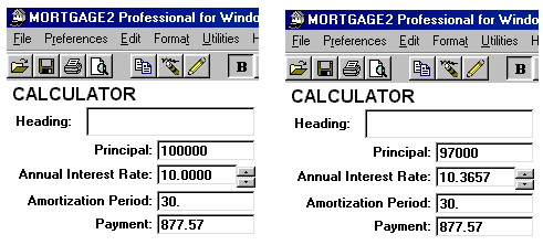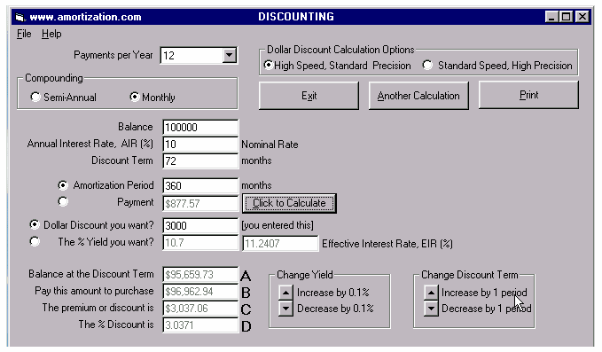 AMERICAN EXAMPLE: In the USA, the Truth in Lending interest rate is called the APR. For a 30 year loan at 10% plus the three points repaid over the full 30 years, the APR is 10.37% (you enter the 3 points, 3% of $100,000 as $3000 as the Dollar Discount). Another way to arrive at the APR for the full 30 years is to use the CALCULATOR and input the information and calculate the payment as $877.57 per month. Subtract the $3000 from the principal, continue to make payments the same and recalculate the AIR to be 10.3657%, thus the APR is 10.37% at two decimal places. The APR depends upon how long you keep your loan. If the $100,000 loan was repaid after 6 years (72 months) rather than 30 years (360 months) its APR would be 10.70% as shown below.