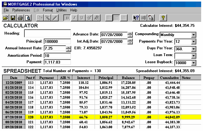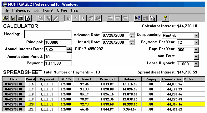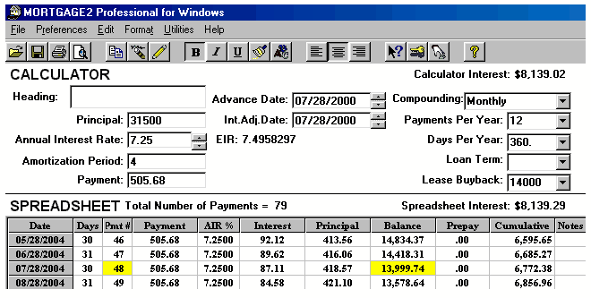 A Leasing company offers a lease on a $31,500 factory new vehicle for 48 months at 7.25% and asking for monthly payments of $555.68 with no money down (no deposit). The lease buyback (aka the "residual") at the end of the 48 months is $14,000 QUESTION: Is this a fair or reasonable offer? Most lease financing in todays market is nothing more than a loan with monthly payments and monthly compounding with a balance owing (residual or lease buyback) at the end of the lease. The only difference between a lease and a loan is that the leasing company asks for the payments in advance. A simple way of answering this question is to look at it as a loan of $31,500 at 7% with monthly compounding, amortized for 4 years (48 months) with a lease buyback of $14,000. In other words what would the monthly payments be in order to have a balance owing of $14,000 after 4 years. The program is going to calculate the monthly payment. You will notice the monthly payment is calculated to be $505.68 thus the lease company is making a $50 per month profit on payment markup. ANSWER This deal looks fair or reasonable based upon the mathematics of the loan. You can never be 100% certain about the hidden rebates and whether the residual is realistic and fair. That is why you must read the squint print (fine print) on the lease contract. BONUS FEATURE: A unique or handy feature is that by typing in different amounts in the calculator's Residual Value box you can immediately see how the monthly payment changes (while holding the interest rate and amortization period constant). QUESTION: How much would the monthly payments on my $100,000 mortgage at 7% have to be in order to have a balance of $10,000 at the end of 10 years. ANSWER: $1,117.03 per month.