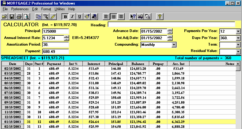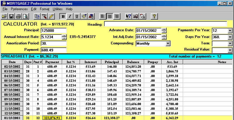 If the outstanding balance is added to any payment in a schedule, the total payment then, is called the balloon payment and the loan is then paid in full. On Jan 15, 2003 after the 12th payment is made the balance is $123,196.42 If on Jan 15th 2003 the borrower made a total payment of $680.49 + $123,196.42 that payment would be called the balloon payment and the loan would be paid in full. This is sometimes called a balloon loan. A simple way to show this balloon payment, especially for clients, is to place the cursor on the payment cell on line 12 of the spreadsheet and change the payment of $680.49 to something in excess of the current balance ($123,196.42) say, $300,000 and press [Enter]. The schedule will then show the 12th payment as the balloon payment.