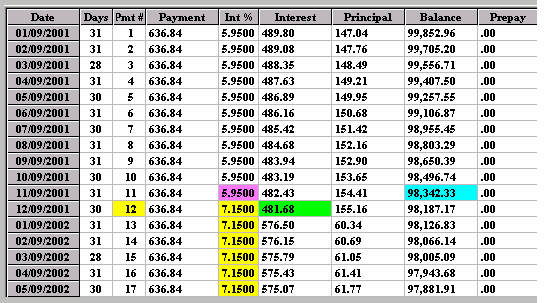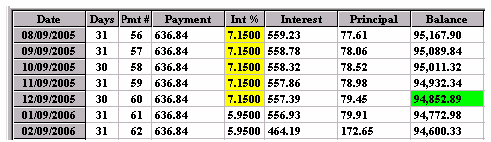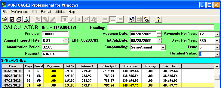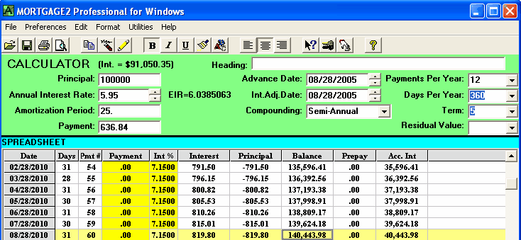 QUESTION: A lender offers a mortgage at 5.95% for the first year and 7.15% for the remaining four years or a blended rate of 6.85% for 5 years. Which is the better option? Let us first generate an amortization schedule based upon the 5.95% rate, then change the rate inside the SPREADSHEET schedule. Assume it to be $100,000 amortized for 25 years and we will use semi-annual compounding as this example is taken directly from a Canadian lenders brochure. We will also assume a constant cash flow meaning that the monthly payment remains the same over the 60 months. Some lenders recalculate and change the monthly payment at each rate change so it is always wise to ask the lender which method they use. We now change the rate from 5.95% for the last four years to 7.15 % as shown below; NOTE: the rate change for the 13th payment is entered at the 12th payment because as soon as the 12th payment is made the rate is immediately changed, that is how the MORTGAGE2 PRO amortization spreadsheet is designed to work. The constant, 360 day monthly interest factor for an AIR of 5.95% with semi-annual compounding is 0.004897965062376 x 98,342.33 = 481.68 (green) The balance owing (at Pmt #60 in green) to the lender after 5 years is $94,852.89 using 5.95% for year one and 7.15% for the next four years. One might be tempted now to just guess at a new rate until the balance after 60 payments is the same ($94,852.89), and that would be the blended rate. It would be nice if it was that simple, but it is not. Lenders reinvest your monthly payment each month (deemed reinvestment) in order to achieve the yield on your mortgage. For example a mortgage at a nominal rate (nominal rates are also called annual interest rates, AIR) of 12% using semi-annual compounding actually gives the lender a 12.36% effective interest rate (EIR). For every nominal rate quoted there is a corresponding effective interest rate due to the type of compounding chosen. If the nominal rate is annually compounded then the effective interest rate is equal to the nominal rate, thus a yearly basis is always implied when one speaks of an effective interest rate. A mathematical "trick" that works only for mortgages that have semi-annual compounding allows one to quickly figure out an EIR from an AIR is to divide the nominal rate by two, shift the decimal place two places to the left, square the result, shift the decimal place two places to the left again and add it to the initial nominal rate; AIR=12% EIR=12.36% One of the unique features of MORTGAGE2 PRO and MORTGAGE2 PRO PRO is the ability to to perform a present value /future value calculation on a cash flow and show what it accumulates to in the future. This is exactly what the lender does. Thus put all of the 60 payments equal to zero and the cash flow of $636.84 to the lender will accumulate to $140,443.98 if the lender reinvests the payment received each month. You now need a simple PV/FV calculator or using the one in MORTGAGE2 PRO that allows one to do a PV/FV calculation as shown below; The 7.028792 % from the PV/FV calculator is the effective interest rate, EIR. To get the corresponding AIR, using the CALCULATOR, take a few guess' at an AIR, and recalculate on any variable except the AIR, until you get the EIR to come close to 7.029 The 6.91% (which corresponds to the EIR of 7.0293703) is the correct blended rate that is equivalent to year one at 5.95% and the next four years at 7.15%. ANSWER: The lender offering a blended rate of 6.85%, is actually giving borrowers a bit of deal! Below is proof that 6.91% is the correct blended rate. That same cash flow appreciating at 6.91% (deemed reinvestment) for the next 60 months accumulates to $140,447.77 which is within $3.79 of the initial calculation. The difference is because the outcome is very sensitive to the number of decimal places used. It should be mentioned that you can also use a 365 day year in this analysis. North American lenders use both methods for monthly payment mortgages for various reasons. Below is the exact analysis as above, except using a 365 Days per Year basis, which is called an exact day monthly payment mortgage in the industry. You will notice after 60 payments (12 payments @ 5.95% and the remaining 48 payments @ 7.15%) that the borrower owes the lender approximately 20 dollars more using this method ($94,872.22 - $94,852.89 = $19.33). The lender is making a "little" more via the 365 day method. A complete analysis shows that the blended interest rate is greater in the third decimal place, and thus quoting rates to 2 decimal places hides this fact. The purpose of the exercise is to demonstrate the method used to verify the blended rate figure within reasonable limits. As mentioned above the deemed reinvestment method is very sensitive to the number of decimal places used in the calculation. Here is an area where standardization would be in order at least in North America.