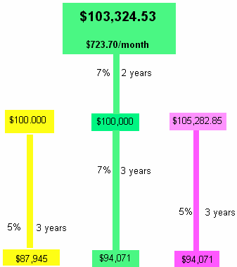 A Lender that offers you a blended rate as an alternative to paying the Interest Rate Differential, IRD, to break your mortgage is not doing you a favour. The example below will prove you cannot win! For example, assume you borrowed $103,324.53 on July 11, 2001 at 7% (semi-annual compounding) with monthly payments of $723.70 based upon an amortization period of 25 years. You signed a term for 5 years, .. meaning the interest rate would remain constant at 7% for the next 60 months. You are approaching your 24th monthly payment and you notice in the newspapers that 3 year term rates are 5%. You ask your lender the cost to switch to the lower rate of interest. The Lender informs you that the IRD amount is $5,282.85. This IRD would have to be paid along with your 24th payment or added to the balance after your 24th payment. You decide not to pay the IRD. Your lender then offers you a blended interest rate for the remaining 3 years. The graphical summary is shown below. The initial mortgage of $103,324.53 was purposely chosen so that the balance owing after the 24th payment would be exactly $100,000 to make the comparison easy to visualize. The MORTGAGE2 PRO program allows this flexibility. After two years there are 3 paths to follow if you keep your monthly payment the same at $723.70. The green middle path you do nothing and remain inside the current term. The purple path on the right with the IRD added to the $100,000 balance shows the same balance owing at the end of the 36 months, that is $94,071. The yellow path on the left, the lender allowed you to switch to the 5% without paying the IRD.