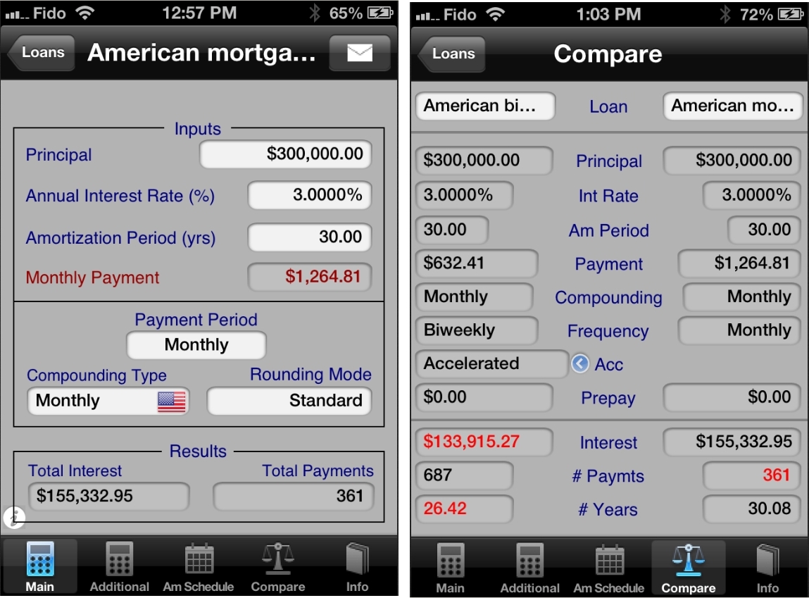 The American and Canadian calculators, the IRDcalculator and the MORTGAGE2 PRO software will be available on the Apple Store for the Apple 3G, 3GS and the soon to be released 4G iphone and Apple ipad. Soon for a dollar or two you will be able to have the convenience of an amortizationdotcom mortgage calculator on your iphone and/or ipad. It will calculate the monthly payment for a Canadian (“semi-annual compounding”) or an American mortgage (“monthly compounding”) and calculate the true weekly and biweekly payments that have become so popular in Canada and the USA. Shown are screen captures of an American monthly payment calculation and the corresponding true biweekly payments. American consumers beware because there are US lenders that claim to offer you a biweekly payment mortgage but on closer examination you will discover it is not a true amortization schedule based upon well established annuity principles. After the launch of the amortizationdotcom calculator the IRDcalculator will then be available for the iphone and the ipad. Following the IRDcalculator, will be the complete amortizationdotcom program with all the functionality of the Windows version 5.10 on your ipad.