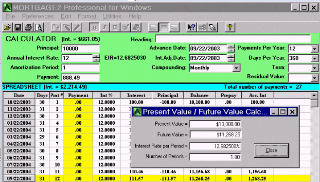 Annual interest rate (AIR) The AIR is the number most often quoted in the newspaper. It is often called the nominal interest rate when the compounding frequency is quoted along with it. In the USA its often and incorrectly called the APR. The APR, by definition, is the new AIR once all the costs of the loan or mortgage are factored in and it is therefore higher than the AIR. The EIR is the same as the AIR only when the compounding is “annual compounding”. If the compounding is more frequent than annual compounding then there is an EIR associated with every AIR. As the compounding becomes more frequent the EIR increases. An AIR of 12 % with monthly compounding has an EIR of 12.6825% whereas the EIR is 12.7474% with daily compounding. Strictly speaking, “a 12% mortgage with monthly compounding” does not mean your mortgage interest is compounded monthly. What it really means is that if you miss your monthly payment the interest is compounded monthly. The incorrect nomenclature is so deeply rooted in the Canadian and American financial industry it seems impossible to correct the sloppy vernacular. The Present Value and Future Value are exactly related by a mathematical equation over a stated period of time. If the period of time is years, then the interest rate from the equation is the interest rate for the year and by definition that is called the effective interest rate, EIR. Time and money are exactly related and Einstein referred to this as the 8th wonder of the world. If you borrow $10,000 at 12% for one year and the lender is using monthly compounding then the monthly payments as per the calculator (green) would be $888.49. If you decided not to make payments then the interest is compounded monthly and added to the outstanding balance. At the end of one year you owe the lender $11,268.25 as shown by the negative amortization schedule. Notice how the PV/FV calculation shows the same EIR as the green calculator. In other words the Principal in the green calculator is the PV and line 12 of the negative amortization schedule is the FV. By adding 1.0 to the decimal EIR (1.0 + 0.126825) and multiplying it by the initial Principal (PV) the FV of $11,268.25 is obtained. The effective interest rate is the true rate a lender can theoretically yield because it is based upon the premise that the lender reinvests your monthly payments as he receives them each month.