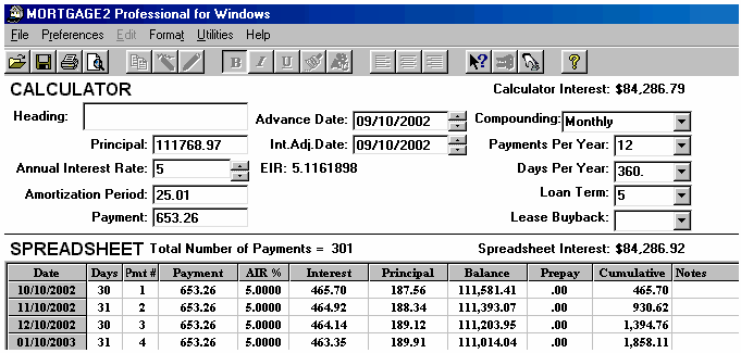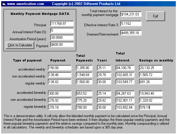 Assume you have a mortgage of $111,768.97 at 5% amortized for 30 years. The traditional monthly payments would be $600. The MORTGAGE2 PRO Calculator or any other financial calculator would calculate the "regular" biweekly payment to be $276.18 for the next 30 years and save you $578.19 in interest over the 30 years. The $276.92 biweekly payment (same yearly cash flow as the monthly payment) would save you $1,329.92 in interest over the next 29.82 years. The $300 biweekly payment, called the accelerated biweekly in Canada (the yearly cash flow of 13 monthly payments) would save you $19,943.40 over the next 25.14 years. The interest cost for the $300 biweekly mortgage is $84,287.63 Biweekly mortgages are rare in the USA. One can easily use the MORTGAGE2 PRO CALCULATOR to pick a monthly payment by trial and error and recalculate the amortization period until the Calculator interest is close to $84,287.63 As a first guess try a monthly payment of 300x26/12=$650 Increase it by increments of 50 cents and recalculate the amortization period by clicking on the "Amortization Period" prompt message in front of the Amortization Period Calculator box. The calculator interest of $84,286.79 is close enough to say you have approximately an "equivalent mortgage" over the next 25 years. As a side bar it is interesting to note that at low interest rates of 5% or 6% the weekly and the biweekly payment plans are almost the same as far as savings are concerned. Some people may not get too excited about savings of approximately $20,000. When the rates are in the 12% range the weekly and biweekly really start to outperform the traditional monthly mortgage, as can be readily seen by the example below. The same mortgage at 12% doing the accelerated biweekly payment of 574.83 would save $133,908.61 in interest over 18.73 years which is quite significant.