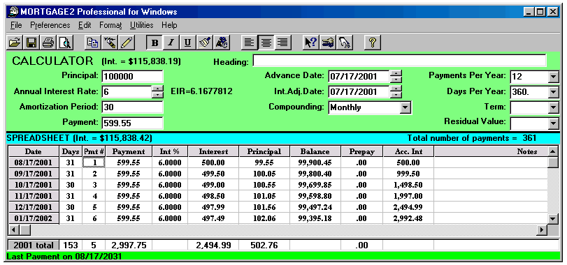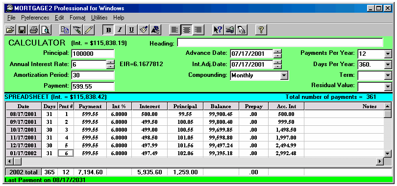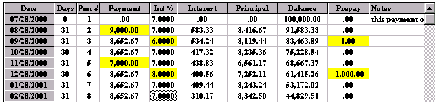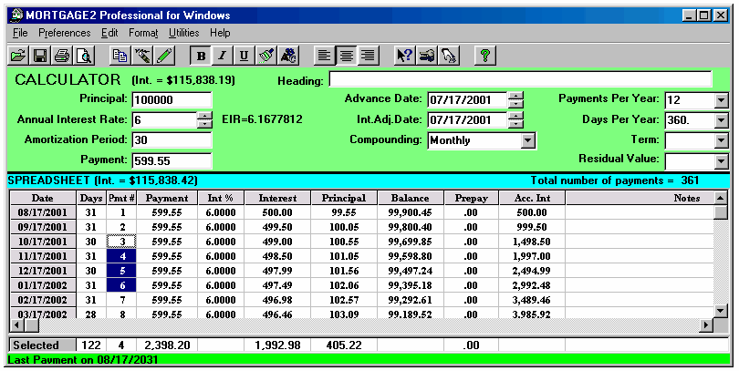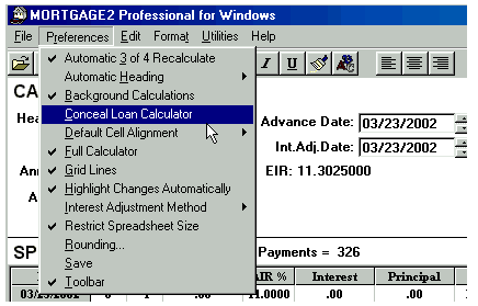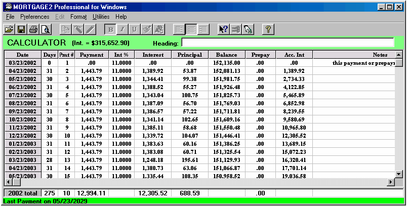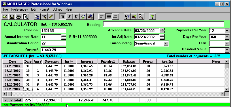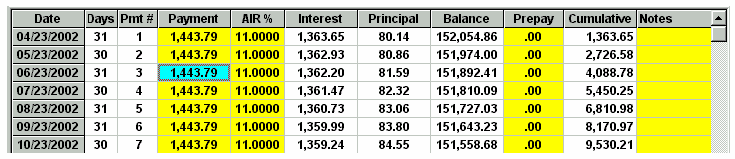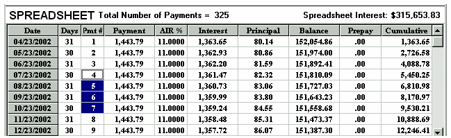 Working in the SPREADSHEET 1.. highlight an area prior to printing 2.. to make changes to a schedule 3.. to highlight a part of a column for its totals (clicking and highlighting with the mouse) For example, the amount of principal paid in 2001 is shown below as $502.76 on the 2001 Total line at the bottom of the SPREADSHEET because one of the cells (Pmt#1) was clicked by the mouse. And if you click using the mouse on Pmt#6 cell in the year 2002 the total line shows the yearly totals on the 2002 total line. The sub totals for payments #3 to #6 are shown on the Selected line at the bottom of the SPREADSHEET. Using the mouse you can highlight any area you wish for subtotals. Once you make changes to a schedule there is no reason to go back to the CALCULATOR as the CALCULATOR now only serves as a reference point. To avoid confusion you could go to the Preferences Menu and click on, Conceal Loan Calculator. The CALCULATOR would disappear. All you need to do is click on the first payment of the SPREADSHEET and click on the yellow pencil icon to insert an extra payment and you have the schedule below is simplified; (Screenshot 14) The spreadsheet contains all the information needed to be self explanatory (the compounding will be shown in the heading when it is printed). Payment #1 is "Days 0" and payment #2 is really the first payment due one month after the advance date of 03/23/2002. Once a SPREADSHEET cell is clicked on, the tool bar displays the icons that are active, by changing from grey to a colour. The cell you click on will display a fuzzy border as shown in the third payment below (powder blue). The only way to exit the spreadsheet is to click on any of the 11 calculator cells. The ENTER key enters your new information and moves you down to the next cell. If no information is entered, pressing the ENTER key moves you down one cell without any changes. The arrow keys are used to enter information in a cell and move in the direction pressed. Changes can only be made to the yellow coloured columns plus the Date column. Below is an example screen shot of a SPREADSHEET that shows how flexible the SPREADSHEET can be.