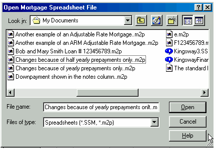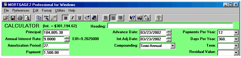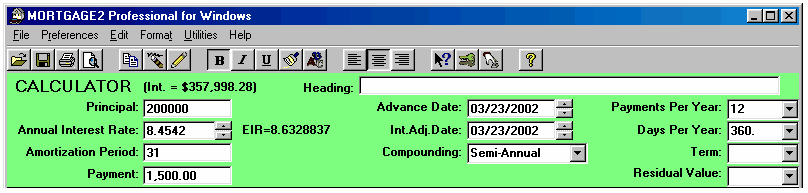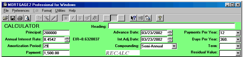 Click here for a Quick Reference Sheet The main screen starts with default information in the CALCULATOR and an amortization schedule SPREADSHEET based upon the default information in the CALCULATOR. Each time new information is entered in the CALCULATOR the SPREADSHEET will automatically generate a schedule based upon the new information. When you first run the program the cursor will be in the Principal box of the CALCULATOR and the background colour of the box will be blue. To move from box to box to change information press the tab key. The tab key moves you forward and shift+tab moves the cursor backwards. Holding the tab key down will cause the cursor to move in a continuous loop in the CALCULATOR. If you change any three, of the first four CALCULATOR boxes the remaining box will be automatically recalculated. You cannot specify information for all four boxes, as that would leave nothing to be calculated. For example, what would the interest rate have to be in order to borrow $200,000 for 31 years at monthly payments of $1500??? Answer, 8.4542%. The effective interest rate (EIR), 8.6328837 is displayed to the right of the nominal rate of 8.4542%. The EIR depends upon the type of compounding selected. The interest adjustment date defaults to the advance date unless you specify a different date. The Term input box is only important if you are going to renew a mortgage before the term expires, and effects only the calculation of the interest rate differential, IRD. If you change only one of the first four CALCULATOR boxes then you must decide which of the remaining boxes to recalculate, just like any hand held financial calculator. The instant you make a change to any CALCULATOR box the RECALC message appears and the SPREADSHEET is cleared. The CALCULATOR is waiting for one of two responses. Either you are changing two more calculator boxes or you are going to recalculate one of the remaining boxes. To recalculate a box, click on the box and press the F6 key or click on the prompt message in front of the CALCULATOR box. Both methods recalculate the information, in that box and the RECALC message will disappear. The SPREADSHEET will again appear with appropriate information. For example, what if you wanted the amortization period to be 27 years and pay $1500 per month at a 9% interest rate, how much Principal could you borrow?? Answer, $184,805.38 When the SPREADSHEET contains the appropriate mortgage information you can save the schedule. If the file/schedule you were making changes on already had a name you can click on File, Save and it will be saved with the changes. If you try to exit the spreadsheet before saving your spreadsheet changes you will be prompted by the message; If you are working on a new file/schedule (making changes) you can save it as a file with a unique name by clicking on; File, Save As. Your amortization schedules can be saved with meaningful names which will make it easier to recall when opening spreadsheet files as shown below;