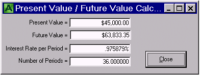 The following example of an interest accruing loan was purposely chosen even though the interest rate is high compared to the current rates in 2004. This particular example was used extensively by the mortgage brokers section of the Ontario Ministry of Finance in 1992. It is easier for a novice to follow the same example set out in the governments publications. Once the concepts are understood then any rate or principal can be used in full confidence. A mortgage with a face value of $45,000 is written up with an annual interest rate of 12% utilizing “semi-annual compounding, not in advance”. The loan is to be repaid in three years. No payments of principal or interest are to be paid during the three years. At the end of three years the outstanding principal and interest will be repaid in one payment. The total cost of all the fees relating to the loan is $3500. QUESTION: What is the effective interest rate of this loan? ANSWER: Just about any financial calculator could be used to solve this problem providing you are capable of calculating the semi-annual compounding, monthly, interest factor, i. Where: i = [(1+R/2)^(1/6)] – 1 and R = the annual interest rate i = 0.009758794 and the ^ operator is the exponent operator or you could use the MORTGAGE2 PRO, Utilities Menu and select, Interest Factors,
