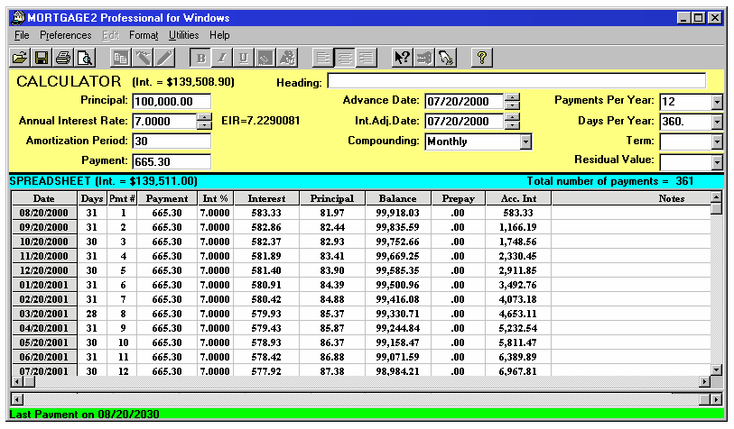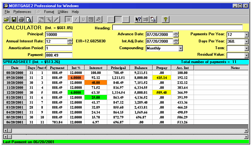 DIGRESSION (Screenshot 2) The initial Annual Interest Rate, typed into the calculator box, of 12% (1% per month) calculates the $100 interest portion of Pmt #1. The 6% annual interest rate, shown in green (.5% per month) typed into the Int% cell of pmt #2 calculates the $40 interest portion of pmt #3 (.005 x $8000 = $40). The 6% annual interest rate, shown in orange (.5% per month) typed into the Int% cell of pmt #5 calculates the $25 interest portion of pmt #6 (.005 x $5000 = $25). The prepayment figures in yellow where specifically chosen so the interest calculations were easy to see. This digression will help one understand why an extra payment was inserted at the start of the amortization schedule example shown below. Because the interest calculation for the very first payment in the amortization schedule is based upon 7%, the initial data, we can employ a unique feature in the MORTGAGE2 PRO PRO program. Place the cursor on the very first payment line of the schedule and insert a payment by clicking on the yellow pencil symbol. The new schedule will appear as below, (inserted payment shown in light blue); Change the interest rate to 5% for the first six months as shown below. Now make all the payments zero in the amortization spreadsheet, down to and including payment 73. This is actually a unique feature of MORTGAGE2 PRO PRO as it is generating a negative amortization schedule which has the same effect as doing a future value calculation on the monthly cash flow. The value (in green) $150,505.51 is the future value of a series of payments of 665.30 appreciating at 5% for the first six months and appreciating at 7% for the last 66 months. Using any financial calculator it is now possible to calculate the overall interest rate over the 72 month period, by doing a variation on the Present Value (PV) / Future Value (FV) keys. set PV= 100,000 FV= 150,505.51 n=6 years Calculate i%=7.05132 The interest calculated, 7.05132 (i%) represents the effective interest rate (EIR). The EIR is always greater than the stated annual interest rate (AIR) due to the method of compounding selected. By trial and error and typing in various Annual Interest Rates (AIR), starting with 6.7% on the MORTGAGE2 PRO calculator it does not take long to see that an AIR of 6.8332% with monthly compounding is exactly the same as an EIR of 7.05132%. ANSWER to QUESTION 1 If the ABC Lending Co. offered you a different annual interest rate of 6.8332% using monthly compounding it would be exactly the same as this 5% for the first six months smoke and mirrors option. To be consistent, in vernacular, you could also call this stated annual interest rate of 6.8332% with monthly compounding, the overall interest rate as mentioned early in the example. In a perfectly simple world all you would need to know, in order to compare this smoke and mirror option, is the EIR of 7.05132% vs 7.2290%. When you borrow any money you are always paying the EIR because that is the rate you would be getting if you borrowed money from yourself and reinvested each monthly payment at the same rate payable to yourself (this is called deemed reinvestment). The 7.2290 is the EIR of the mortgage at 7% with monthly compounding, over the 72 months.