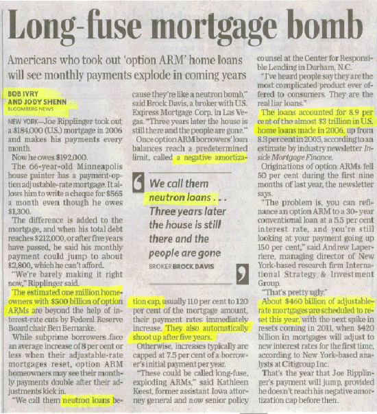 A Canadian university professor published a study that indicated borrowers taking on a Canadian variable rate mortgage saved money in interest costs compared to a traditional fixed rate mortgage. It appears the concept of averaging interest rates worked out in favour of the borrowers. In the USA variable rate mortgages are known as adjustable rate mortgages (ARM). The problem with variable rate mortgages/adjustable rate mortgages is that unless the borrower has the capability of continuously monitoring the loan or mortgage via a continuously changing amortization schedule the mathematics can become confusing and complicated. For example, perhaps if Mr Ripplinger had been given an amortization schedule upon signing his mortgage contract he would have been better prepared for reality 5 years down the road. An amortization schedule would have alerted Joe to the fact that on his 52nd payment of $565 per month he would be at the 120% cutoff point in his negative amortization schedule. An amortization schedule would have also driven home the fact that if he wanted to pay off the mortgage it would require $1300 per month payments for 30 years. The monthly interest alone on his very first payment was $1166.33 and GROWING each month and being added to the outstanding balance! This was a death spiral scenario. Maybe he thought he was going to win the lottery? Lenders in the USA giving ARMs, (that default to negative amortization schedules) to borrowers are actually giving them the tools to blow their brains out, financially speaking. Pun intended. Borrower beware!