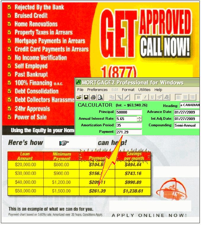 The politically correct mentality and faulty mindset (that everyone is ENTITLED to home ownership whether they can afford it or not) that enabled the sub prime mortgage fiasco to spread throughout the USA and the world is still alive and well even in Canada. It seems that if one can fog a mirror one can still get a loan in today’s upside down world! Loopy Lenders are still everywhere to be found and now survive because of the need for bailout loans. A bailout loan is fine, but please don’t lie to the borrowers! An amortization schedule would easily alert a naive borrower to the fallacy of this loopy lenders advertisement that appeared in a recent Canadian publication. First of all, the loopy lender cannot get the monthly payment correct for a 25 year amortization period. In fact the monthly payment of $261.39 almost turns the mortgage into a 40 year amortized loan.