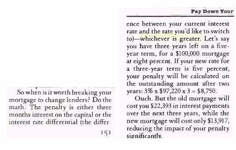 IRD MISINFORMATION An article appeared in the November 2002 issue of a well known North American magazine, "Pay Down Your Mortgage Fast". For the most part the article was well written and the journalist was well intentioned. Her treatment of Interest Rate Differentials left a lot to be desired. She was wrong in her analysis and conclusion regarding the IRD or 3 month penalty. The fact that she used the 3 month penalty which is greater than the IRD in this example makes her incorrect conclusion, paying the "penalty" is advantageous, even more ludicrous! In plain English, a $100,000 mortgage is being discounted at 8% down to 5% for the next 36 months. Mortgage brokers do this calculation every day. It is not rocket science! The Interest Rate Differential, IRD, ("C", a premium in this example) is $7,967.97. A third party person could pay a premium of $107,967.97 for this $100,000 mortgage and would receive 36 monthly payments of $763.21 resulting in a yield a 5% mortgage. The simple way to view this is IRD example is as follows. After paying the IRD or premium, in order to get the 5% interest rate, the 36 monthly payments of $763.21 will get you to the same point in time and the same balance ($95,655) owing as shown by the two amortization schedules below. One can either purchase a mortgage at a discount in order to get a higher yield or one can purchase a mortgage at a premium (the premium in this example is called the IRD) and therefore get a lower yield. It is worth repeating, .. paying the premium (the IRD in this example) will not save you in interest costs. In this example, think of it as a fork in the road. You owe $100,000 and have a choice of an 8% path or a 5% path plus a toll. The 8% road costs you nothing to get to the 36 month point and then you owe $95,655.40 where as the 5% road costs you an upfront toll of $7,967.97 and 36 months later you are at the same point as the 8% road and owe the same balance of $95,655. Obviously you are using the same monthly payment in either path. One must always compare identical cash flows in analysis. The well intentioned author was correct in saying, . most lenders in Canada will charge the greater of the two "penalties", however lenders do make errors and sometimes in the borrowers favour. It is always wise to verify the "penalty" with a professional mortgage broker. Before making a decision like this one, consult a professional mortgage broker, that is their business!