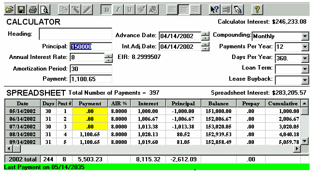 Never, never skip payments, especially at the beginning of a mortgage (or loan) unless absolutely necessary. Below is an example of the extra cost you would pay if you skipped the first three payments of a mortgage. If the first three payments were missed and the interest rate remained the same over the 30 years your balance owing after 30 years would be $35,628.25 instead of zero. Imagine the surprise if you did not have an amortization schedule and blindly paid monthly payments for thirty years. A yearly statement telling you how much principal and how much interest you paid is not very informative. Bottom line, skipping the first three payments in the example below costs you an extra $35,633.06 over the thirty years! |