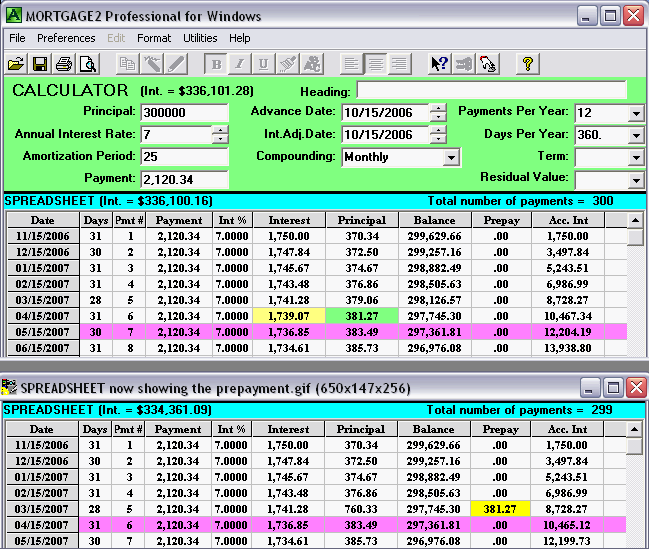 Before computers became common household appliances an old tried and true method of prepaying principal on a mortgage without having to recalculate the amortization schedule, after each prepayment, was to prepay principal as per the amortization schedule. If this method is followed exactly, the only amortization schedule you will ever need (obviously your interest rate must remain constant over the term) is the initial amortization schedule that your lender gave you on closing day (or should have). Lets use the example of $300,000 at 7% amortized for 25 years with monthly payments of $2,120.24. The mortgage is completely open. This method works for all blended payment amortization schedules regardless of the “type of compounding” used. If the 300 payments are made as per the amortization schedule the total interest paid would be $336,101.16 as can be seen in the powder blue SPREADSHEET interest line. If the principal portion, $381.27 (green cell) of payment 6 is prepaid along with payment 5 on March 15th 2007 the interest savings is the interest portion of payment 6 which is $1,739.07. In other words, by prepaying payment #6 principal one month in advance you save payments #6 interest portion. This is easily verified by subtracting the SPREADSHEET interest of the second amortization schedule, $334,361.09 (that shows the prepayment made) from the SPREADSHEET interest of $336,101.16 from the regular amortization schedule. The result, 1.. Interest savings of $1,739.07 A little extra effort but you will not have to recalculate or print the amortization schedule or pay someone to do it for you.