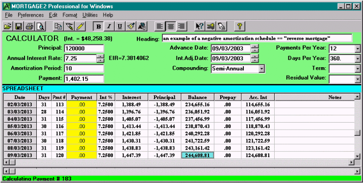 This topic is covered in detail by an excellent article, Reverse mortgages fraught with pitfalls by Business Editor, Ellen Roseman, Toronto Star, July 20th 2003. The mathematical aspects, that will be covered here are actually quite simple because a reverse mortgage is just another name for a negative amortization schedule. Assume your home has a current market value of $400,000. A reverse mortgage company would give you say 30% of that value in cash. You now have $120,000 in your hand and have a loan for the next ten years where you do not make any payments (a negative amortization schedule) and the monthly interest accrues and is compounded semi-annually. The reverse mortgage company actually adjusts the annual interest rate every year but for the sake of the example we will choose a constant 7.25% which is the going rate in Canada in 2003. You simply generate an amortization schedule for 10 years at 7.25% for monthly payments on a principal of $120,000 and then do a negative amortization schedule by making all the payments zero. If one wanted to verify the reverse mortgage companies calculations it would be a simple matter of inserting the appropriate interest rate for each year before doing the negative amortization schedule. After 10 ten years you would owe the reverse mortgage company $244,608.81