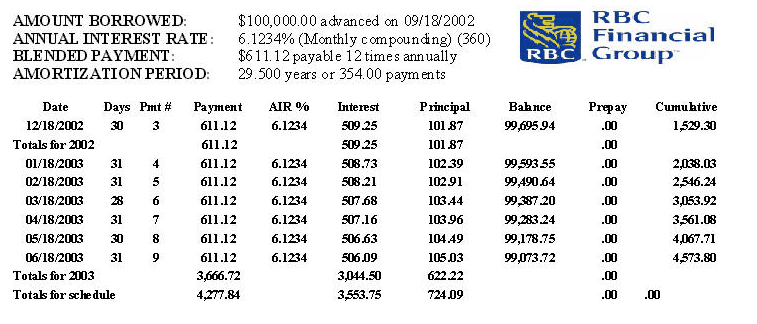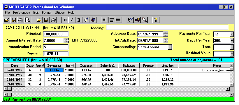 You buy a house for $100,000 and the deal closes on the 26th of May (you sign the papers). The closing involves giving the buyer the cheque for the $100,000. Your lender advanced you the mortgage money of $100,000 but the lender may not want the monthly payments to fall on the 26th of each month. Your lender wants the monthly payments to be on the first of each month. June 1st becomes the Interest Adjustment Date and July 1st becomes the first blended monthly payment. The interest adjustment method is accessed from the Preference Menu as Alt, R, I, choose C or S The default as shipped is Compounded, and it is whatever the type of compounding that is currently selected. The Exact Simple Interest method is available for backward compatibility. Some lenders prior to 1995 used this latter method and variations of it. Most lenders today believe that if the body of the mortgage was calculated in accordance with semi-annual compounding then the interest adjustment should also be semi-annual compounding. Just a reminder, whatever your preferences are be sure to click on save before leaving the Preference Menu in order to save them MORTGAGE2 PRO.PRE file. For example; if a $100,000 ($100,000 mortgage at 7% amortized for 5 years with monthly payments of $1,975.41 using semi-annual compounding) was advanced on May 26th the interest for six days for the use of the $100,000 is $113.16 and payable to your lender on June 1st. One month later, on July 1st the first blended monthly payment of $1,975.41 is due or owing to your lender. The June 1st payment is all interest and serves to move the advance date forward. MM/DD/YYYY is the default format. The Interest Adjustment Date, IAD, always defaults to the advance date unless you enter a different date. The IAD cannot be earlier than the advance date only equal or later. For many reasons most lenders prefer payments to be at the first of the month. When you are selling your house the deal may close at any time thus interest adjustments must be made to make the loan payments coincide with the lenders payment preference. You buy a house for $100,000 and the deal closes on the 26th of May (you sign the papers). The closing involves giving the buyer the cheque for the $100,000. Your lender advanced you the mortgage money of $100,000 but the lender may not want the monthly payments to fall on the 26th of each month. Your lender wants the monthly payments to be the first of each month. June 1st becomes the Interest Adjustment Date and July 1st becomes the first blended monthly payment.