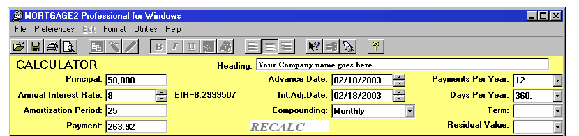 The principal is the amount of money borrowed. In previous versions of MORTGAGE2 PRO this was called amount borrowed. They both mean the same thing. The principal is the amount of money advanced to the borrower on the advance date. Thus if $50,000 was advanced (borrowed) on June 1st 1995, one month later on July 1st 1995 the first blended monthly payment is due to the Lender. The maximum amount that can be entered is $100,000,000 less one penny. That is 99,999,999.99 NOTE: Do not type in commas or $ symbols.