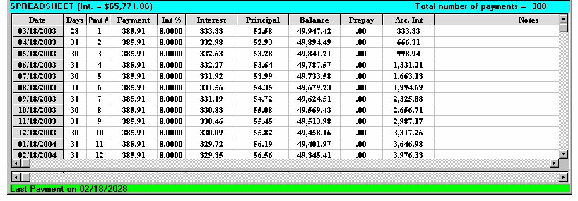 Depending upon the previously saved (F9) default values, when the program is started the calulcator at the top of the screen will appear as (Screenshot 1). The 12 input boxes (Heading: plus 11 data boxes) are where the initial mortgage data is entered. To move to any of these input boxes use the mouse and click on the box or hold down the Tab key until you arrive at the appropriate box. The "Heading:" box can only be accessed using the mouse. As soon as a value different from the default is entered in any one of the first four boxes the RECALC message appears in the middle of the screen. (Screenshot 2). The RECALC message informs you that you need to recalculate any one of the 3 remaining items (3 of 4 feature). You decide which box to recalculate by holding down the Tab key until the box is highlighted in blue and then press F6 to recalculate that box, then the RECALC message will disappear. Or using the mouse you can place the cursor on the prompt message in front of the appropriate box and left click, to recalculate. If you enter new information in any three of boxes the fourth box will automatically be recalculated. You cannot enter data in all four boxes, in other words there must always be something to recalculate. It is mathematically impossible to specify all four boxes. The first 12 payments of an amortization schedule for this scenario are shown below, assuming all payments are made on the specified dates, there are no changes and the interest rate is the same over the 30 year amortization period. To print the entire amortization schedule, click on File, Print and Spreadsheet. To print any portion of the amortization schedule, first highlight the area of the schedule with the mouse by clicking and dragging the cursor, then click on File, Print and Highlighted Range. For example, (Screenshot 5) would only print payments 3 to 9 inclusive. A Printed Schedule will look like (Screenshot 6)