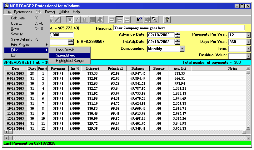 Click on the Heading: box with the mouse to gain access. Type in anything you want to be printed at the top of the amortization schedule when printed. Real Estate lawyers that generate many schedules a day often have the their company name in this spot thus eliminating the need to retype it each time.
