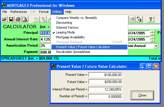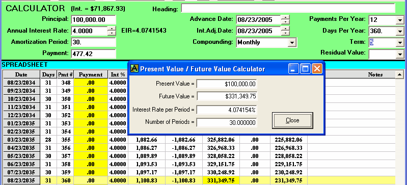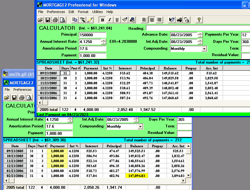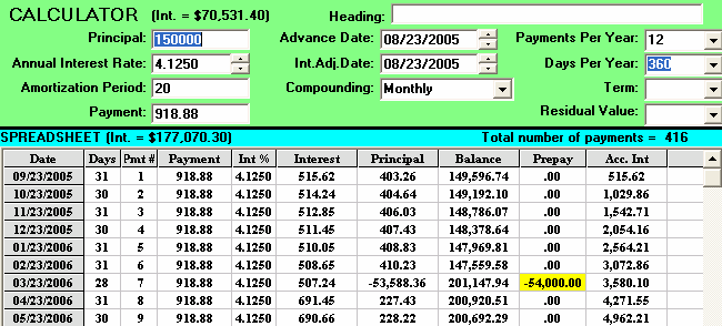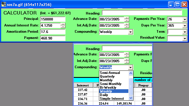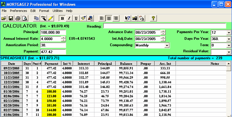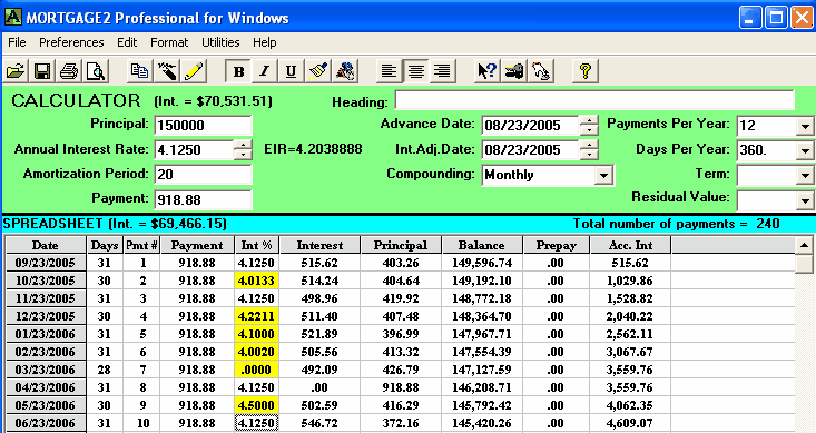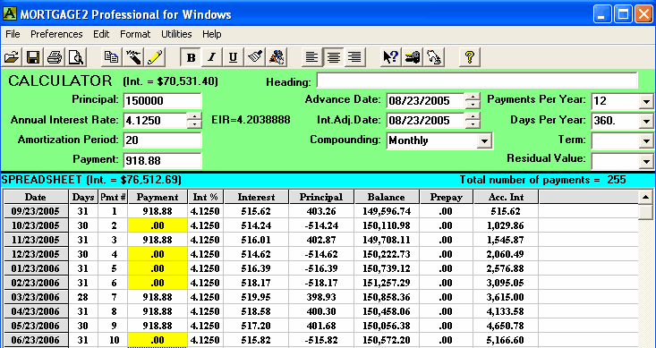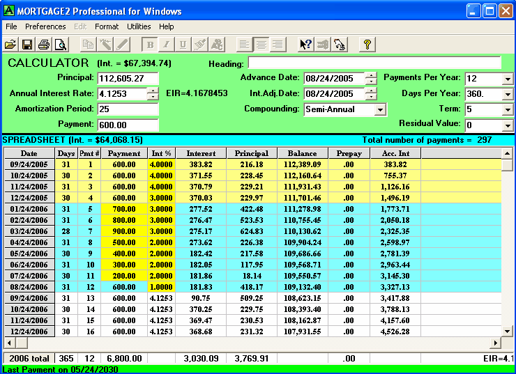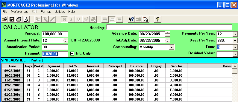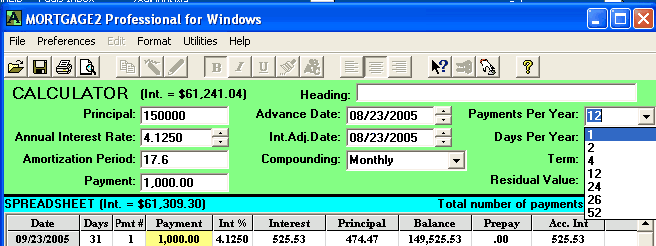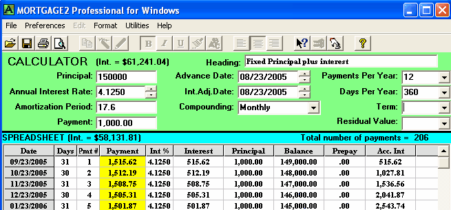 A summary of the types of amortization schedules the MORTGAGE2 PRO software package calculates: 1.. A fixed rate mortgage (FRM) with blended monthly payments. 2.. A negative amortization schedule where all or some of the payments are set to zero. 3.. An amortization schedule with missing payments and the interest is recapitalized (deemed reinvestment) with or without penalties being charged. 4.. ARM An adjustable rate mortgage where the rate can be changed every month or every day. 5.. An amortization schedule based upon the Bankers year or the exact day 365 day monthly blended payment mortgage. 6.. Weekly, biweekly, semi- monthly, monthly, quarterly, half yearly and yearly payment schedules. 7.. Amortization schedules based upon any combination of payment frequency and compounding frequency. 8.. Amortization schedules based upon a fixed principal payment plus interest. 9.. An amortization schedule with yearly anniversary payments. 10.. An amortization schedule with negative prepayments as required in a builders loan. 11.. An amortization schedule that allows one to easily change payment frequency in midstream and continue on with the same schedule. 12.. An amortization schedule that shows an expanded present value future value scenario. 13.. A Monthly Compounding, Interest Only payment, amortization schedule. 14.. A Present Value/Future Value, Financial Calculator is available from the Utilities Menu. 15..A declining interest rate schedule with a constant payments or declining payments.. Custom Logo Schedule - If you rename your corporate logo image as RB.BMP file and make the logo a small file, it can be displayed and printed on the top right hand corner of every amortization schedule printed.