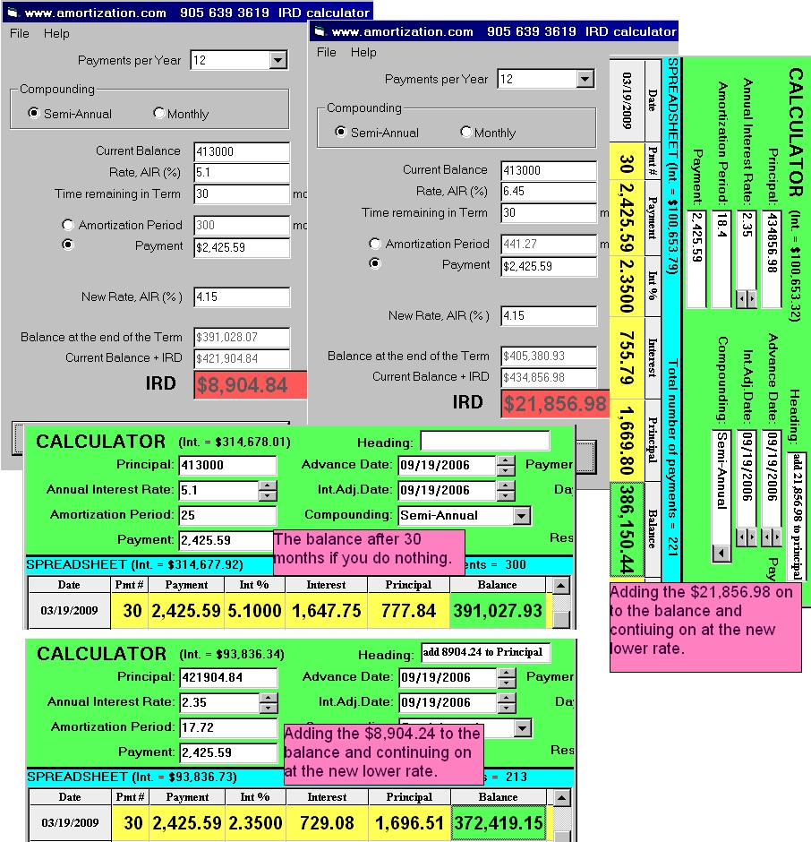 No matter which IRD calculation is used you would be saving money because of the 2.35% rate, not because you paid the IRD. The IRD based upon a 5.1% rate is $8,905 and the savings because of the lower 2.35% rate (arrived at by subtracting the balance owing after 30 months) is $18,609. The IRD based upon a 6.45% rate is $21,857 and the savings because of the lower 2.35% rate (arrived at by subtracting the balance owing after 30 months) is $4,877. The difference in savings to you is $13,731. There is a lesson to be learned. Always read the squint print in the mortgage documents before signing. I would bet the farm that some banks have a clause in the fine print of the mortgage documents stating that you agree to pay the IRD based upon the posted rate even though they allowed you to pay the discounted rate. I could be wrong!