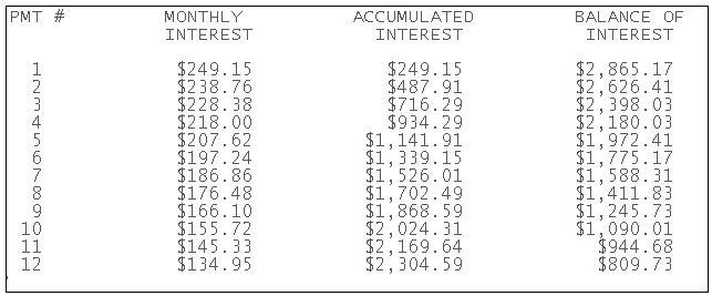 Some lenders use the Rule of 78 to arrive at the interest portion of a loan payment. The rule of 78 takes the total interest for a loan and apportions excessive interest to the early payments as compared to an amortization schedule. If the lender uses conventional calculations to arrive at the total interest for the loan but uses the rule of 78 to apportion the total interest cost over the life of the loan then do not take out a lengthy loan and pay it off early. The example below will illustrate the point. A simple example of $24,000 at 12% with monthly compounding, amortized for two years (24 monthly payments). An annual interest rate of 12% is purposely chosen because most people can do the very first monthly interest calculation in their head. 12% a year with monthly compounding is 1% per month. Thus after one month the interest for $24,000 is $240 (see the green cell below, 1% which is 0.01 thus .01 x $24,000 = $240). The rule of 78 will use the same total interest of $3,114.32 however it apportions $249.15 to the very first payment. A traditional amortization schedule apportions $240, the correct amount to the first payment. RULE of 78 Interest allocated over 24 payments is shown below (white background). If the loan was paid back as $24,000 plus the $3,114.32 over 24 even payments of $1,129.76 there would be no problem. The problem arises when you pay the loan off early as in after 12 months. After 12 months using a conventional amortization schedule, the balance owing after the 12th payment is $12,715.57 and the accumulated interest paid during those 12 months is $2,272.73 Using the rule of 78 method the accumulated interest paid during those 12 months is $2,304.59 which is $31.86 more in interest. The difference becomes more pronounced as the amortization period and the loan amount increases. For example, on a loan of $100,000 amortized for 4 years at 12% with monthly compounding the difference in accumulated interest paid after one year is $564.82 which is no small change. Scenarios such as this can be avoided by asking for an amortization schedule. Once you look at the breakdown of the very first monthly payment you know where you stand. "an amortization schedule, .. don't take a loan without one"
