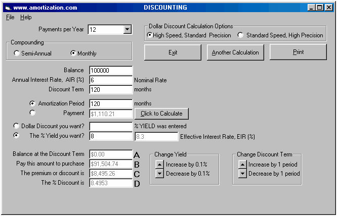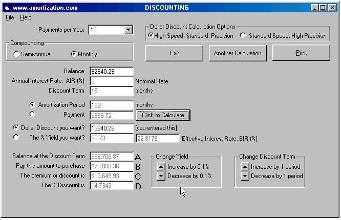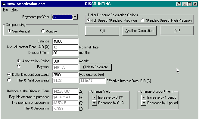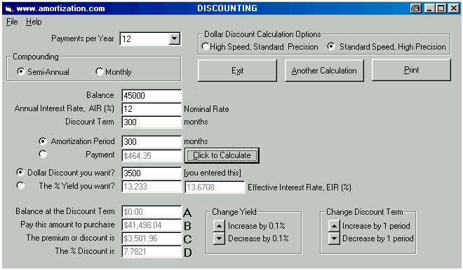 *** READ ME FIRST BEFORE YOU CONTINUE *** TCOB over the entire Amortization Period Calculating YIELDS on a Discounted Mortgage TCOB over the entire Amortization Period A Broker arranges for a Lender to hand you a cheque for $45,000 and you hand your Broker a cheque for $3,500 to cover the cost of the total fees. The blended monthly payments (principal and interest) for a loan of $45,000 are $464.35 based on an annual interest rate of 12% with semi-annual compounding and amortized for 25 years. If the borrower is making payments for the next twenty five years based upon a 12% rate (constant 12% rate for the twenty five years) what is the impact of the total fees of $3,500? 1.. Set the Dollar Discount Calculation Option to Standard Speed High Precision. It is always recommended to use this setting unless your computer is really slow. The new interest rate due to the impact of the total fees is 13.233 % which translates into an effective interest rate of 13.6708 % due to semi-annual compounding. Thus the TCOB is 13.67 % at two decimal places. It is interesting to note that the American, Truth in Lending legislation would have the value of 13.23% quoted as the APR, rather than quoting the new EIR as in Ontario, Canada. This TCOB calculation could also have been handled by the MORTGAGE2 PRO program as follows; This is the same loan information in the CALCULATOR. Subtract the total fees of $3,500 from the principal and recalculate the annual Interest Rate as shown below; The new EIR because of the total fees is 13.670034 thus the TCOB is 13.67% at two decimal places. The logic is that you are making 300 payments based upon a $45,000 loan but in effect you only really have $41,500 thus the interest must be higher.