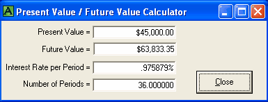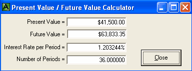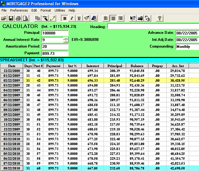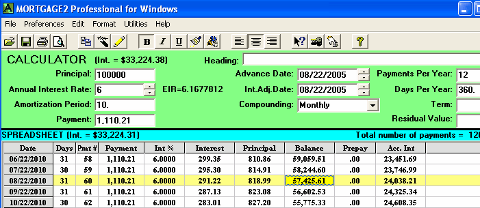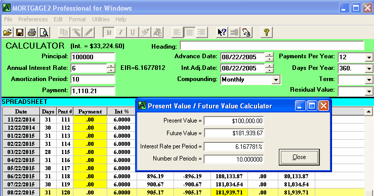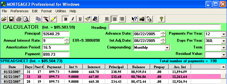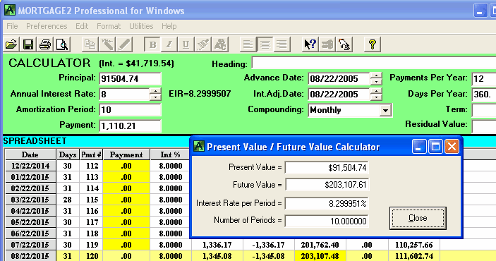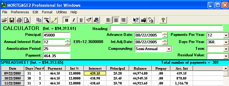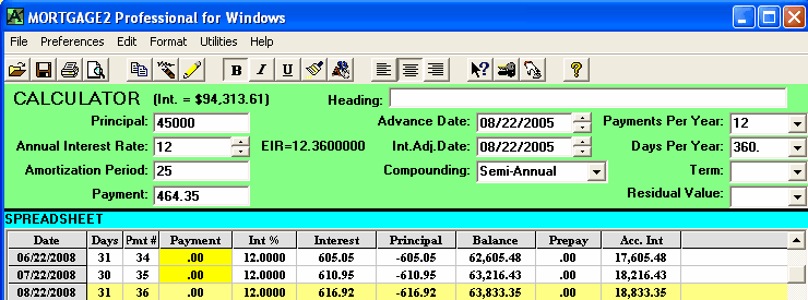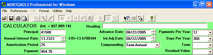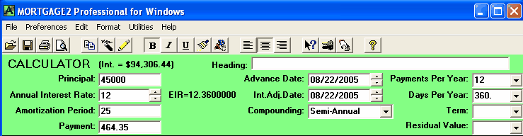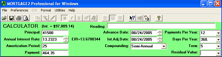 A mortgage has a face value of $45,000. The interest is to be 12% with semi-annual compounding, not in advance. The loan is to be repaid in three years. No payments of principal or interest are to be made during the three years. At the end of the three years all the outstanding principal and interest will be repaid in one payment. The total cost of all the fees is $3,500 and thus the borrower is actually receiving only $41,500 because the broker is getting his $3,500. A financial calculator could be used for this calculation, .. providing you know how to calculate the "12 % semi-annual compounding, monthly interest factor" which is 0.009758794179192. This factor is required to calculate the Future value (FV) of $45,000 in 36 months. One of the unique features of MORTGAGE2 PRO software is its ability to do PV/FV calculations without requiring you to understand how to calculate this interest factor, 0.009758794179192. 1.. You make the MORTGAGE2 PRO amortization schedule a negative amortization schedule by making all the payments equal to zero for the first 36 months. The balance at 36 months is the Future Value of $45,000 growing at 12% per year semi-annually compounded, which is $63,833.35 What you have is a series of FV results in a grid format from one month to 36 months which is more informative than the regular PV/FV financial calculator format. The factor 0.009758794179192 can also be obtained by using the MORTGAGE PRO Utilities Menu. 2.. Using a financial calculator the new monthly interest factor needs to be determined. In other words, what does the new interest really have to be on a monthly basis in order to grow $41,500 to $63,833.35 over 36 months? The new monthly interest factor is 0.01203244 as a decimal. To calculate the effective interest rate (EIR) add 1.0 to this new monthly interest factor and multiply by itself 12 times. Shown mathematically as; (1.01203244)^12 = 1.154338 Subtract 1.0 and multiply by 100 and the effective interest rate is 15.43 % at two decimal places. Thus the TCOB is 15.43%